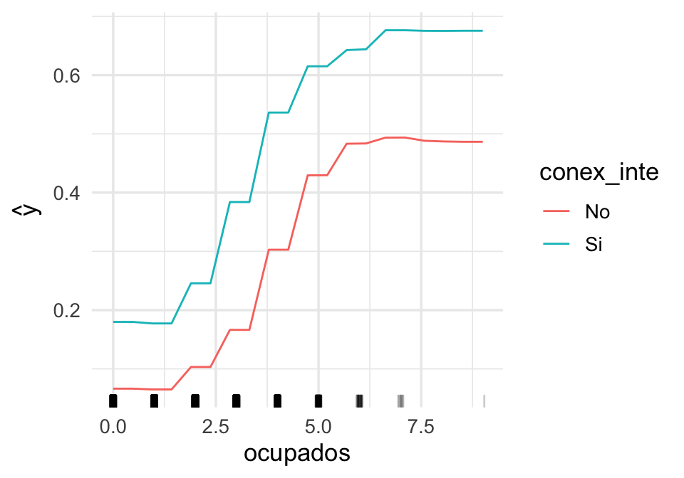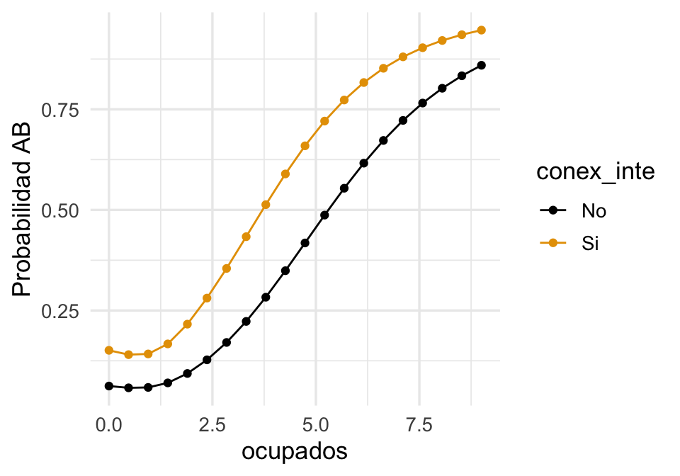 Para modelos con menos de unas 10 variables, también podemos fijar algunas variables en valores que nos interesen, y variar las restantes. En el siguiente ejemplo, fijamos localidades urbanas con mas de 100 mil habitantes que cocinan con gas en tanque (que es la mayoría):