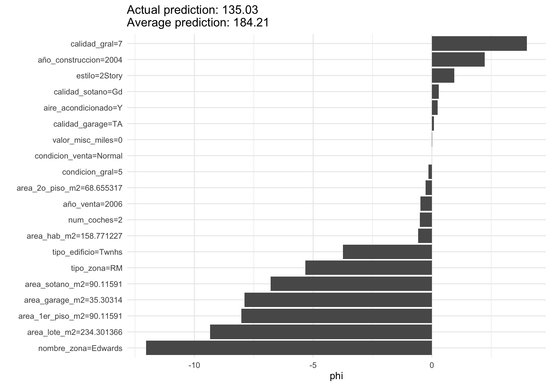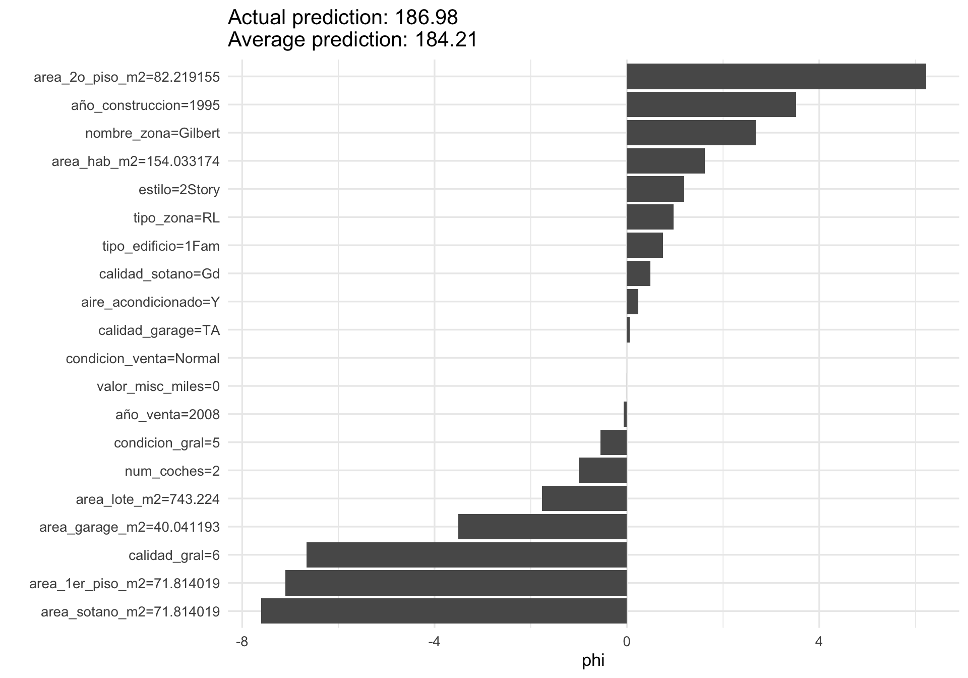 La suma de los valores phi da (aproximadamente, por el algoritmo usado) la diferencia entre nuestra predicción para esta instancia y la predicción promedio:
