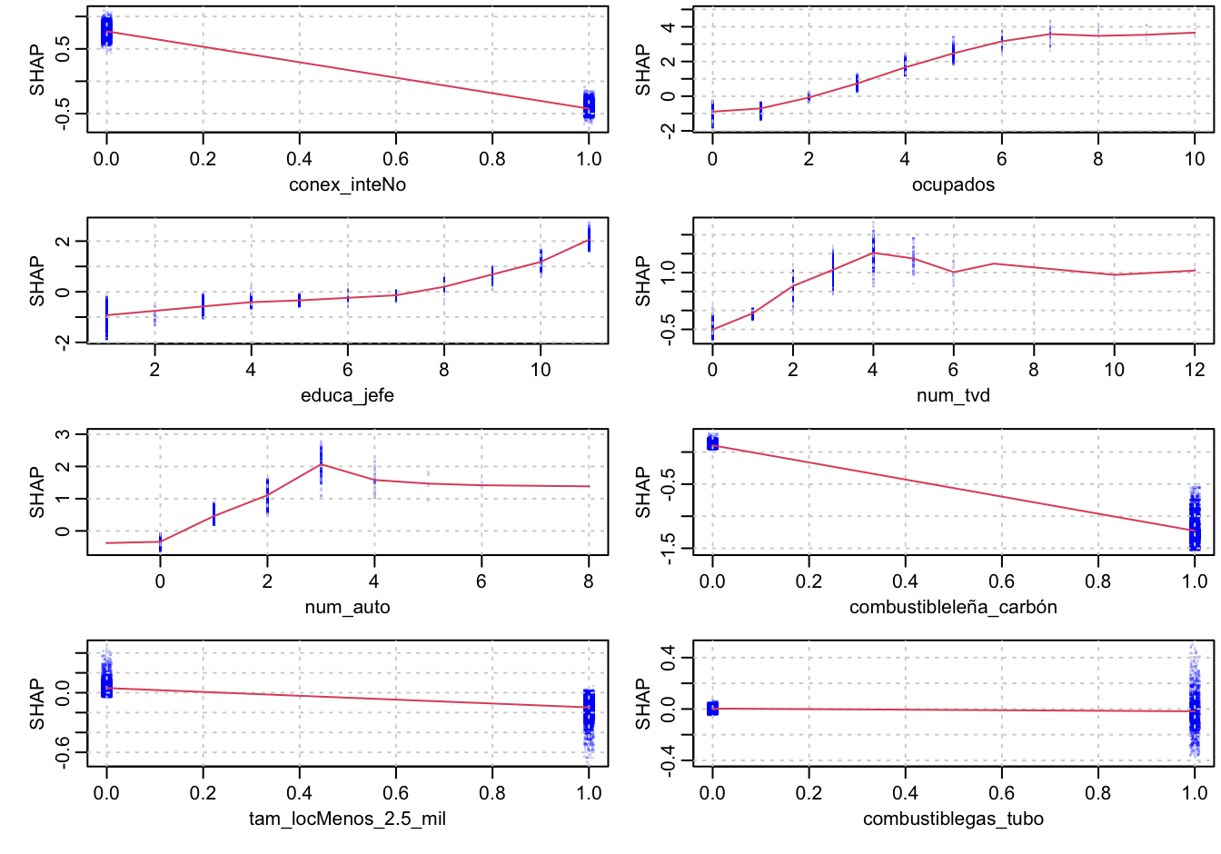 shap_nse <- xgb.plot.shap(mat_x, model = boost_nse, top_n = 8, n_col = 2)