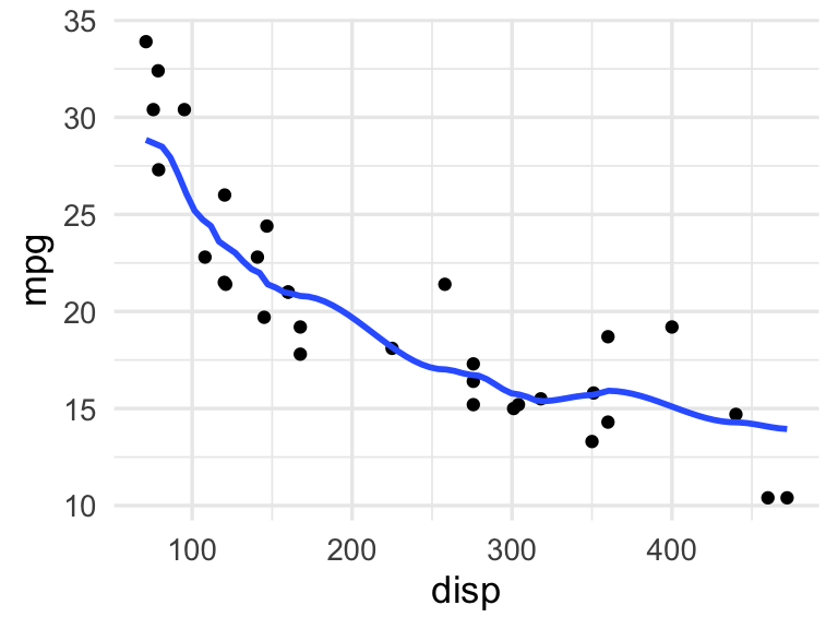 ggplot(mtcars, aes(x = disp, y = mpg)) +