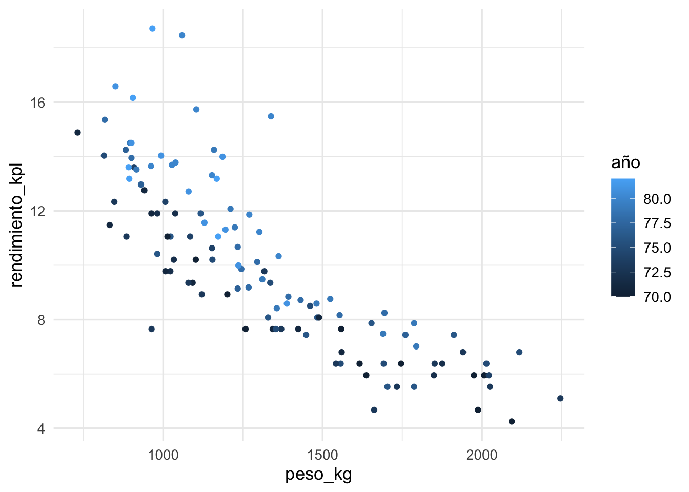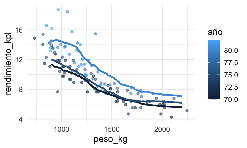 ggplot(datos_entrena, aes(x = peso_kg, y = rendimiento_kpl, colour = año)) +
